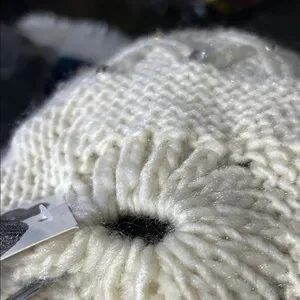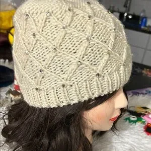 Stay warm and stylish with this elegant cream knit beanie adorned with sparkling rhinestones. Perfect for adding a touch of glamour to your winter wardrobe.