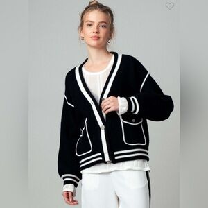 Stylish black cardigan with white stripes and button closure. Features two front pockets.