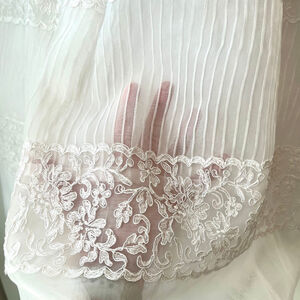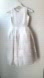 Crafted in white organza and lace layered over satin with alternating embroidered floral lace bands and sheer organza-style pintuck pleats, this sleeveless dress features a round neckline, midi tea length, hidden back zipper, and a fully lined interior for comfort.