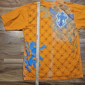Stand out with this bold and rare Avirex Gold Collection graphic tee in vibrant orange. Featuring an elaborate design with a blue winged crest, regal crown detail, gold foil scrollwork, and a striking blue lion graphic. The shirt gives strong Y2K / streetwear vibes and is a must-have for fans of vintage Avirex, Coogi, or throwback hip-hop style.