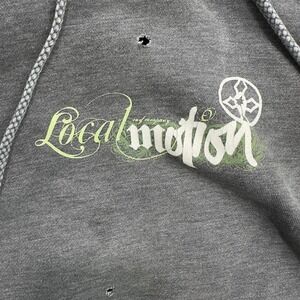 Condition: Heavily distressed — cutoff sleeves, small holes, and faded marks throughout for authentic worn-in vintage character. Features front "Local Motion" logo with subtle surf/skate aesthetic. 80% cotton, 20% polyester fleece lining for soft feel.