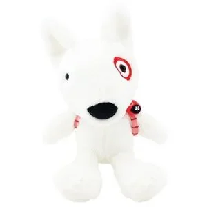 Soft white plush dog toy with charming red and black accents. Ideal for playful pets.