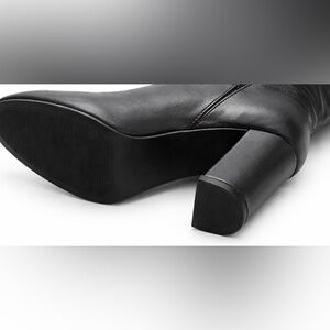 Sleek black over the knee boots. Features Guess logo detail. Perfect for stylish outings.