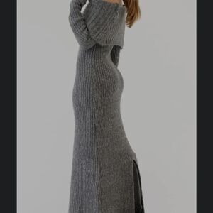 Elegant off-shoulder maxi dress. Ribbed knit texture. Perfect for stylish occasions.