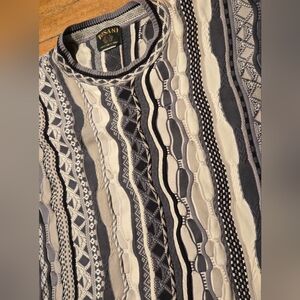 Incredible 90s tosani 3D knit sweater (Coogi) style. This sweater is in great condition, it has some minor repairs along the cuffs. Left cuff has been hemmed up but can be released. (all pictured)