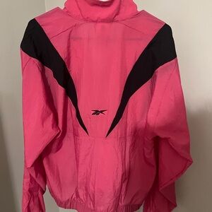 Stylish Reebok jacket. Vibrant pink with black accents. Lightweight and comfortable. Perfect for casual wear.
