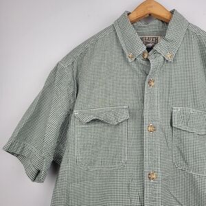 Experience comfort and style with the Duluth Men's Button Down Shirt. This medium-sized green and white checked shirt is crafted from 100% organic cotton, ensuring a lightweight and breathable wear.