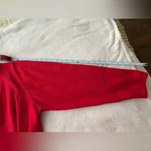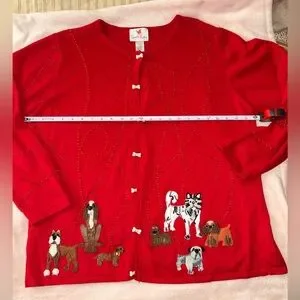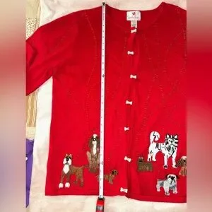 Charming red cardigan with delightful dog designs. Features unique button accents.