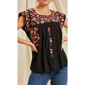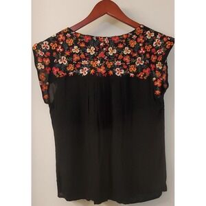 Savanna Jane Blouse M Embroidered Floral Black/Rust/Ivory/Orange Cap Sleeves