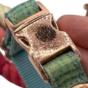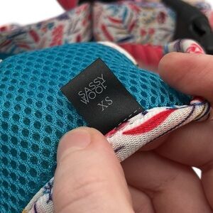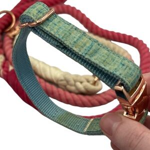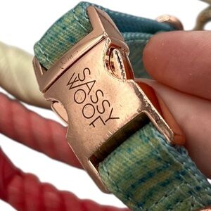 Bundle of Sassy Woof items including a discontinued fall-themed adjustable harness in good used condition (size XS), a pink to white ombre rope leash in used condition, and a size S Blumond blue collar in very used condition with very scratched hardware and needs cleaned. Sizing charts pictured.