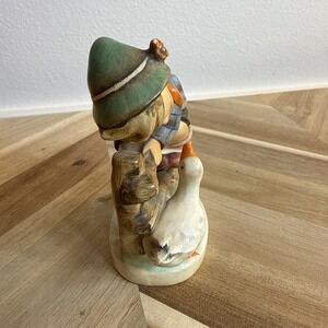 The Goebel Hummel Figurine 195 2/0 TMK 2 "Barnyard Hero" is a small porcelain figurine depicting a boy on a fence, with a design featuring a goose and other abstract elements. Made in West Germany in 1948, this collectible piece belongs to the Hummel collection and is themed around a "Barnyard Hero." The multicolor matte finish and 4-inch size make it suitable for indoor display in any room, adding a vintage touch to the decor.