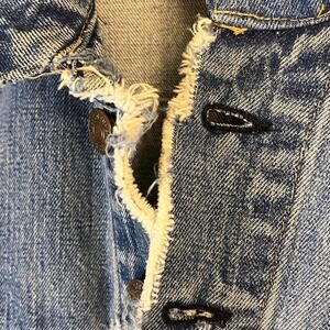 Check out this eternally cool late 1960’s Levi’s Type III 70505 Denim Jacket. Button backs stamped 525. Authenticity distressed in all the right places, this classic piece has been loved and maintained for many years. Cuffs, collar, pockets and buttons and all are intact. The material and seams feel strong and free of dry rot. There is loose stitching, some repairs to the seams (see pic of inside of jacket, not visible on the exterior) and holes as seen in the images.