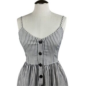 Embrace effortless style with this breezy, striped midi dress. A cascade of black buttons provides a striking visual detail down the front, set against crisp white stripes that elongate the silhouette. The fitted bodice gently gives way to a flowing skirt, creating a flattering A-line shape. Adjustable spaghetti straps allow for a custom fit, ensuring comfort and confidence. Perfect for weekend brunches, garden parties, or strolling along the beach, this dress exudes a carefree yet polished vibe.