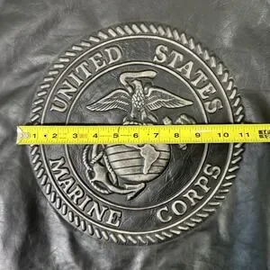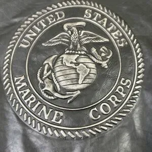 Genuine cowhide leather Marine Corps jacket barely worn. This bomber style jacket has an embossed crest on the back and gusseted sleeves for comfort. Features a zip front, 2 exterior pockets as well as one interior pocket.