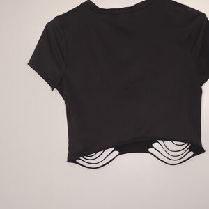 Black crop top with a striking graphic design. Features stylish cut-out details.