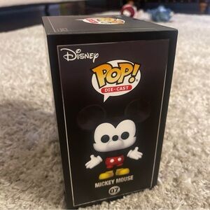Exclusive Funko die-cast figure of Mickey Mouse. Features iconic design in black, white, and red.