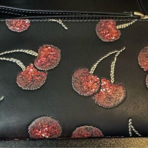 Stylish Coach wristlet with striking red cherry pattern. Ideal for a chic and modern look. Perfect for any occasion.