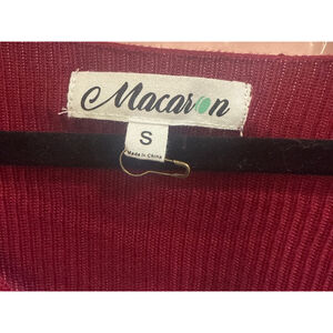This is a Macaron brand women's sweater in size S, featuring a burgundy and white horizontal tie-dye pattern. The garment has a V-neckline and long sleeves, with a ribbed knit texture visible throughout. The back of the sweater shows a similar tie-dye pattern and a boat neck style.