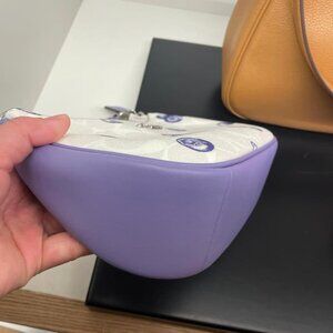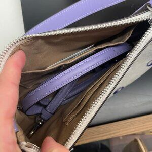 Chic Coach shoulder bag with lavender accents. Cream base with stylish design. Ideal for everyday use.