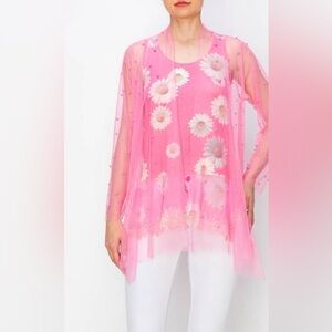 This is an Origami by Vivien sheer pink top, size M, featuring an open-front design. The garment is constructed from a fine mesh fabric and is embellished with numerous small, iridescent pink pearl-like beads distributed across its surface. It has long sleeves