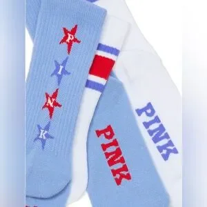Stylish socks from PINK Victoria's Secret. Features blue and white colors with red accents. Comfortable and trendy.