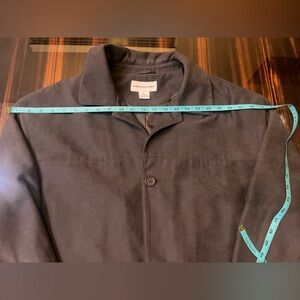 This appears to be a men's dark gray/ brown suede or faux suede car coat or shirt jacket style with a button-front closure and classic collar. This type of garment is versatile, often worn casually over jeans or chinos, and is a popular style for fall and winter layering