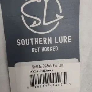 The Southern Lure Men's Size Large T-Shirt in white features a classic crab shack graphic, perfect for those who love fish and the beach. Made of comfortable cotton material, this short-sleeve tee has a crew neckline and a regular fit for a relaxed and casual look. The brand Southern Lure adds a touch of authenticity to this stylish and versatile piece, making it a great addition to any man's wardrobe.