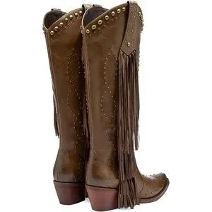Women's Brown Fashion Pointed Toe Chunky Heel Rivet Pull-On Knee High Fringe