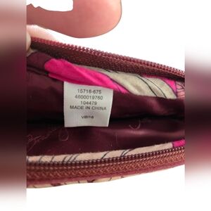 This is a beautiful mini crossbody purse from Vera Bradley, featuring a red exterior with pink and red floral patterns. The purse has a zip closure and an adjustable strap. The interior is lined with polyester and has a width of 6 inches, a height of 8 inches, and a depth of 1 inch. This purse is perfect for women who love a bohemian and hipster style, and would make a great addition to any collection. It has multiple pockets inside and outside the purse as well as a place for your ID and credit cards.