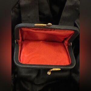 This unique Kent Vintage Black Evening Handbag with Gold Hardware and Integrated Coin Purse is a sophisticated and timeless accessory perfect for a cocktail occasion. Made of luxurious satin with a kiss/kisslock closure, this 1940s inspired purse exudes elegance and class. The black color and gold hardware add a touch of glamour, while the integrated coin purse adds practicality to the design. This handbag is a must-have for any woman looking to elevate her eveningwear look with a hint of vintage charm. Measures approx 12x9” including handle. Excellent condition for age, minor wear on clasps.