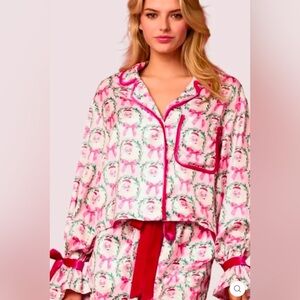 Can we say Pajama party? You'll be the present in this satin pajama set with Santa and bows. The satin pajama set is trimmed in rich rosy velvet piping.