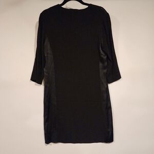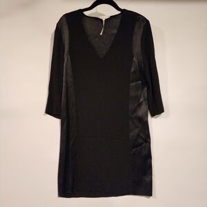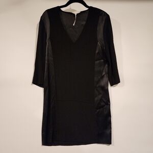 Sandro Paris Black V-Neck Satin Panel Dress 3/4 Sleeve Tunic Shift Dress sz 1