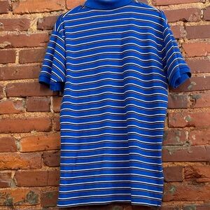 Classic blue polo with white stripes. Features iconic logo. Perfect for casual wear.