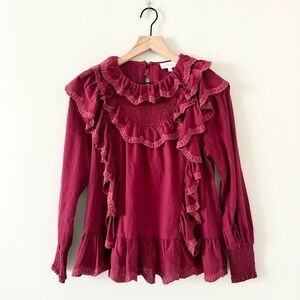Böhme Edith Ruffle Long Sleeve Cotton Blouse in Burgundy - Size XS