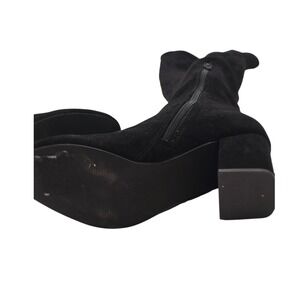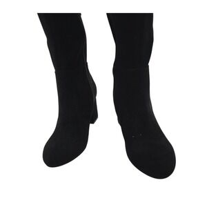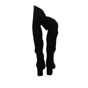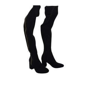 ShoeDazzle Nevaeh over-the-knee boots in sleek black faux suede. Stretchy fit with gold-tone side zip and block heel — the perfect mix of glam and edge. Style them with mini skirts, leather shorts, or skinny jeans for a bold night-out or streetwear look.