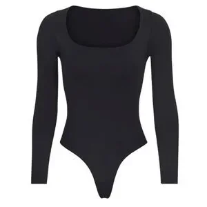 Features: long sleeve, raw cut scoop neck, thong back for no visible panty line, double snap gusset, lightweight, light level of compression, bodysuit, Kim Kardashian, chic, classic