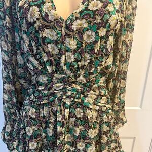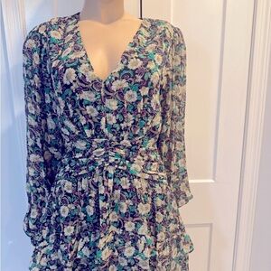 Elegant long sleeve dress with floral design. Features a flattering V-neck and gathered waist.