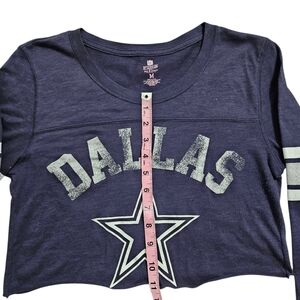 Self cropped blue NFL Dallas Cowboys football long-sleeved tee. Sheer and lightweight. All measurements are in photos.