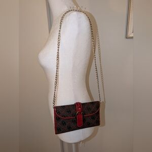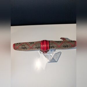 EUC Dooney & Bourke brown monogram wallet with red leather accents and silver snap buckle. Perfect for your holiday accessory list. Exterior is in mint condition and the only call-out on the interior is a pen mark above the heat stamp (shown). Corners have no rubbing. Zipper is zippy and snap is snappy. Add a silver chain and turn this beauty into a crossbody. 9/10