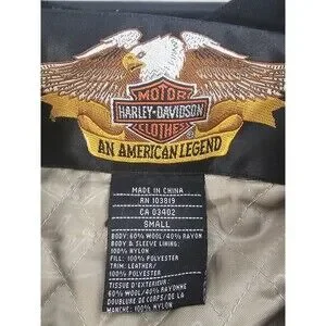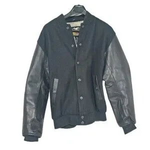 The Harley-Davidson Jacket is a stylish and durable outerwear option for men, made from a leather and wool blend in a classic black color. This varsity jacket features a full zip closure, making it easy to put on and take off. With a size small that runs big, this jacket is perfect for casual occasions in the winter, fall, and spring seasons. The motorcycle theme and riding performance make it a standout choice for any Harley-Davidson enthusiast.