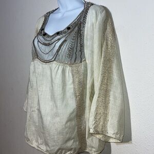 This elegant women's top features a stylish cream and gray design, perfect for any occasion. The intricate detailing adds a touch of sophistication to your wardrobe.