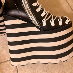 Bold platform boots with striking black and white stripes. Lace-up design for a standout look.