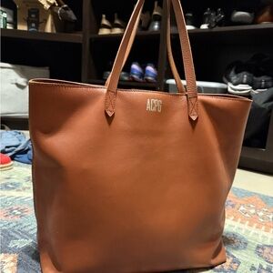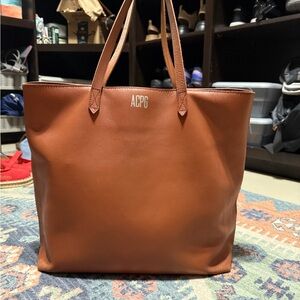 Chic tan leather tote with zipper pocket. Perfect for everyday use.
