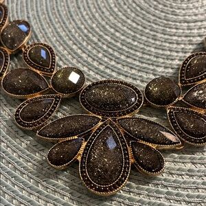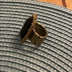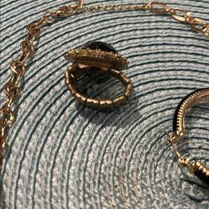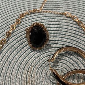 This stunning jewelry set features a gold and black necklace, 2 pair earrings, and adjustable ring. Perfect for adding a touch of elegance to any outfit.