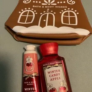 Charming gift set with Bath and Bodyworks Winter Candy Apple travel size hand cream and Bodywash. Comes with gingerbread-themed bag Also Holiday Bear PocketBac Holder and two pocketbacs Winterberry Ice and Moonlit Goddess. All new. Nice gift set
