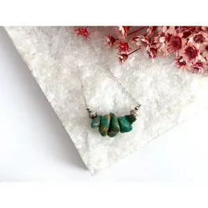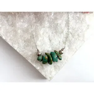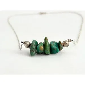 Sterling silver vintage turquoise necklace. The stones are organized in size order but are all slightly different in shape. The stones are framed by sterling beads. The chain is also sterling. Cable chain style. C spring enclosure. Such a statement piece. Very big southwest vibes.