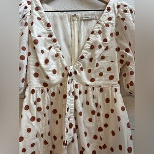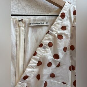 This Abercrombie & Fitch mini dress is the perfect pick for sunny days! It features a delightful brown polka dot print against a crisp white backdrop. With its flattering tie front and romantic ruffle detailing, you'll feel flirty and feminine. It is in excellent condition, like new with tags. Get ready to turn heads!