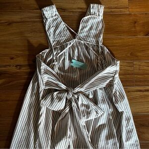 pullover style, breezy and lightweight material, cotton/viscose/modal, adjustable thicker shoulder straps, back tie bow detail, maxi silhouette, full skirt with split front, white with neutral brown vertical stripes, brand new with tags, great for the beach, vacation, coastal, resortwear