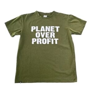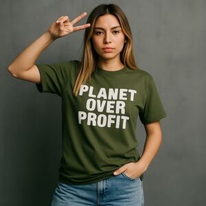 Make a statement with this bold “Planet Over Profit” graphic tee in earthy green.