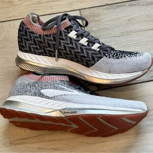 Stylish Brooks Bedlam athletic shoes for women. Features a gray and coral design and color palette. Gray shoe strings. Ideal for running, jogging, walking, and workouts. These are from my personal closet and in excellent condition. I wore them twice and prefer a different shoe for running.